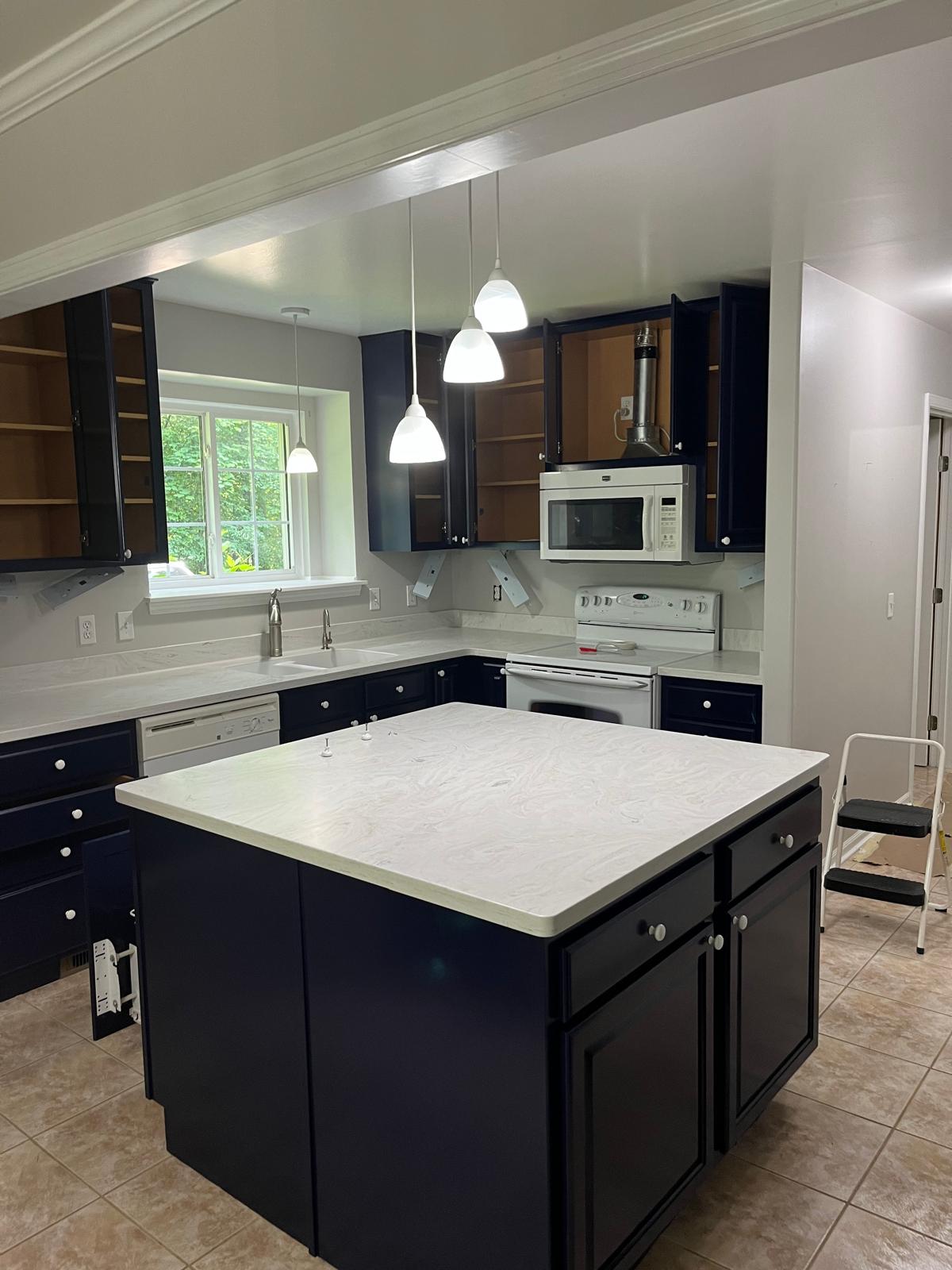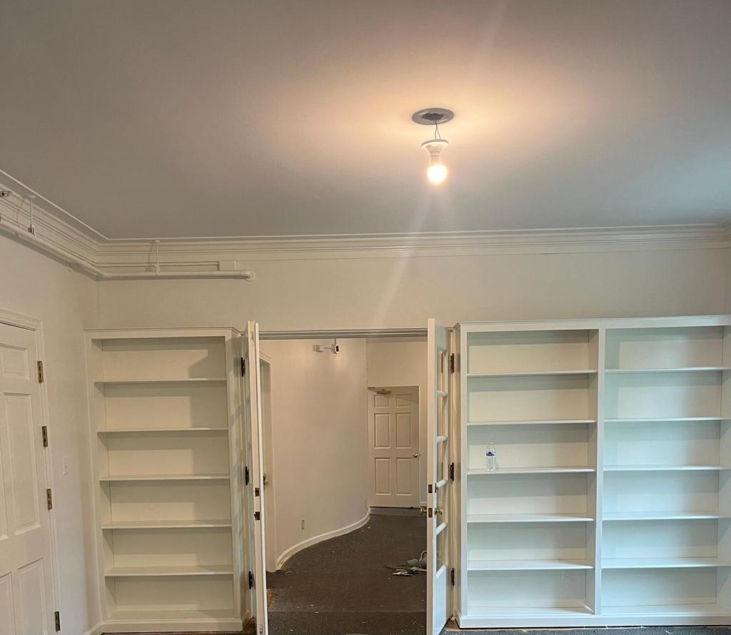 painting kitchen cabinets Spraying bookshelf with white paint as well as paint ceilings and walls. Customer happyCover carpet, spray bookshelf and paint ceilings and walls Repaint of ceiling, walls, baseboards, and trim. Repair small cracks and dents. Cover of all furniture and floor.